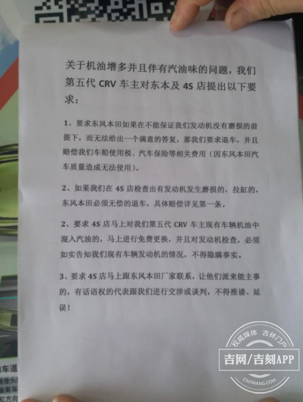 3.要求4s店马上对第五代CRV车主现有车辆机油中混入汽油的,马上进行免费更换,并对发动机进行检查,必须如实告知车主现有车辆发动机情况,不得隐瞒事实。
