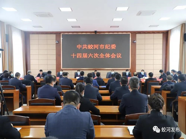 中国共产党蛟河市第十四届纪律检查委员会第六次全体会议于2月20日下午以视频形式召开。会议以习近平新时代中国特色社会主义思想为指导,全面贯彻党的十九大和十九届二中、三中、四中、五中全会精神,深入学习贯彻十九届中央纪委五次全会、省纪委十一届六次全会、吉林市纪委十三届六次全会精神和市委十四届十二次全会精神,研究部署蛟河市全面从严治党、党风廉政建设和反腐败工作。