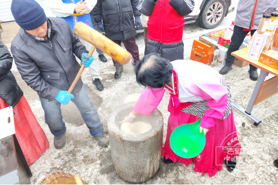 大集现场分区清晰、亮点纷呈,新春氛围感拉满,往来群众摩肩接踵、笑意盈盈。在文化展演区,土城子村的喜庆秧歌扭出新年欢腾,欢快的鼓点、昂扬的舞姿点燃了现场氛围;永兴村的村民现场制作朝鲜族打糕,软糯香甜的口感吸引了大批群众驻足品尝,搭配韵味十足的朝鲜族舞蹈,尽显民族特色,引得现场群众连连喝彩。