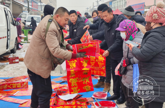 新春书画惠民区设于雾凇鹰猎社区院内,书法家们现场挥毫泼墨,一笔一划间尽显笔墨韵味,手写春联、福字、剪纸免费供村民领取,将新春的美好祝福融入笔墨之中,切实把新春暖意送到群众手中。免费美食品尝区更是人气鼎盛,现场制作的糖葫芦限量发放,热乎的粘豆包、地道的年猪烩菜随心品尝,驱寒暖身的姜枣茶不限量暖心供应,每一份美食都承载着年味,也彰显着大集的惠民初心。