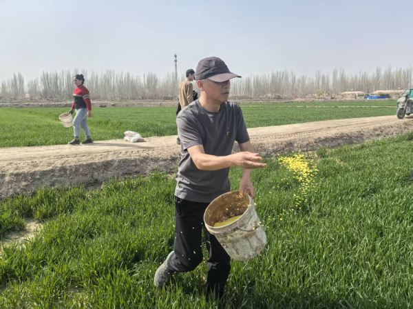 中国人寿驻英阿瓦提乡安居尔村工作队联合村“两委”,在第一书记带领下,组织干部群众下沉田间地头,集中开展拱棚播种、小麦春灌、追肥管护等志愿服务,以实干纾民困、惠民生,推动“我为群众办实事”走深走实。村拱棚种植区内,驻村第一书记轩伟峰、村委会书记阿卜杜热伊木·乌布力顶着棚内热气,与种植户面对面交流,手把手指导科学施肥、规范播种,嫩绿的菜苗已破土而出,焕发勃勃生机。另一边的麦田里,轩伟峰与村委会主任艾散江·麦麦提敏带头示范,手持肥料桶精准撒施追肥,同时向村民宣讲水肥一体化管理、病虫害绿色防控等农技知识,叮嘱大家抢抓晴好天气,抓实春灌追肥等关键环节。