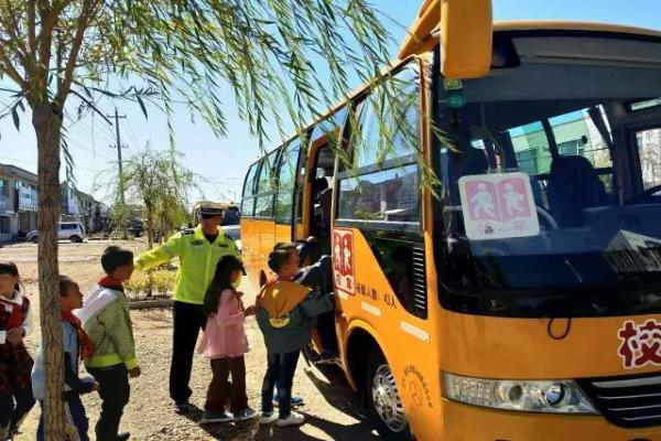 图为交警指挥孩子有序上车