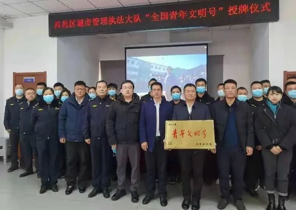 图为昌邑区执法大队“第20届全国青年文明号”授牌仪式