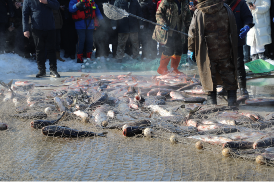 冰洞凿开,号子响起,粗壮的绳索开始缓缓移动。起初是屏息等待,接着,第一尾银鳞跃出冰洞,在阳光下划出闪亮的弧线——刹那间,冰洞仿佛成了涌泉,鲤鱼、鲫鱼、鳌花争相涌出,在网中翻滚跳跃,鳞光与雪光交相辉映。欢呼声如浪潮般卷过冰面,孩子们踮着脚,老人们眯着眼,所有人都被这冰湖之下蓬勃的生命力所震撼。