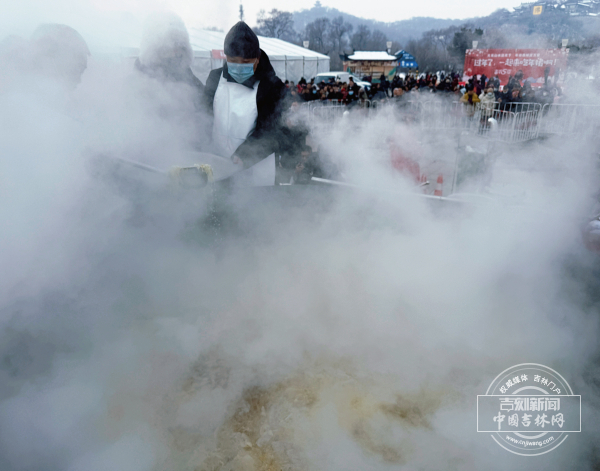 “这一锅食材大约有1吨,里面放了200多斤黑猪肉。”来自吉林市老字号新兴园的杨师傅一边翻动大勺,一边对记者说:“我们从早上8点开始煮,足足炖了3个多小时,让大家一会都能吃到地道的、热乎乎的吉林年猪烩菜!”