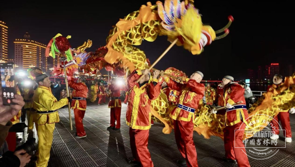 记者在现场看到,随着夜幕降临,共和国广场上舞龙舞狮展演随着锣鼓队的奏乐火热开启,“摸龙身、沾龙气”的祈福互动吸引着大批市民游客踊跃参与。随后,表演团队转战水上,登上“春涛号”游船顶层,在江面之上灵动起舞。两支舞龙队接连完成龙抬头、盘龙聚气、双龙戏珠、祥龙纳福等经典动作,铿锵锣鼓与龙狮表演相映成趣,在松花江面上勾勒出“龙耀松江”的精彩场面,尽显传统民俗的魅力与活力。广受市民欢迎的“游龙竹筏”也沿三道码头至松江中路沿线江面开展巡游,游客可在岸边或乘坐游船沉浸式观赏这场水上民俗盛典。
