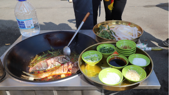 同日,蛟河市2026年松花湖开江鱼美食文化季在庆岭活鱼街火热启动,开街仪式热闹非凡,特色巴拉文化展演精彩亮相。活动现场,大厨们以松花湖鲜嫩开江鱼为核心食材,开展吉林省非物质文化遗产项目“蛟河市庆岭活鱼烹饪技艺”展演,现场烹制地道江鱼,香气四溢,吸引众多游客与市民前来品尝“开春第一鲜”。